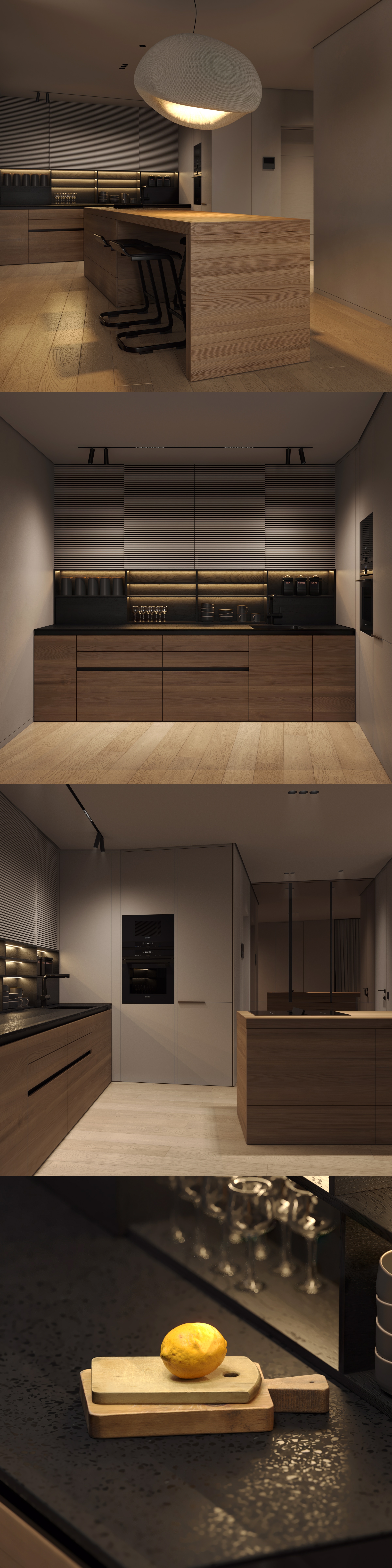 This compact kitchen smartly maximises storage space, making it both functional and stylish. Despite the room's modest size, the design integrates ample cabinets and shelves, creating a seamless and cohesive look. The kitchen features a backlit glass lightbox on the splashback, and the shelves are made of metal, enhancing its modern aesthetic.