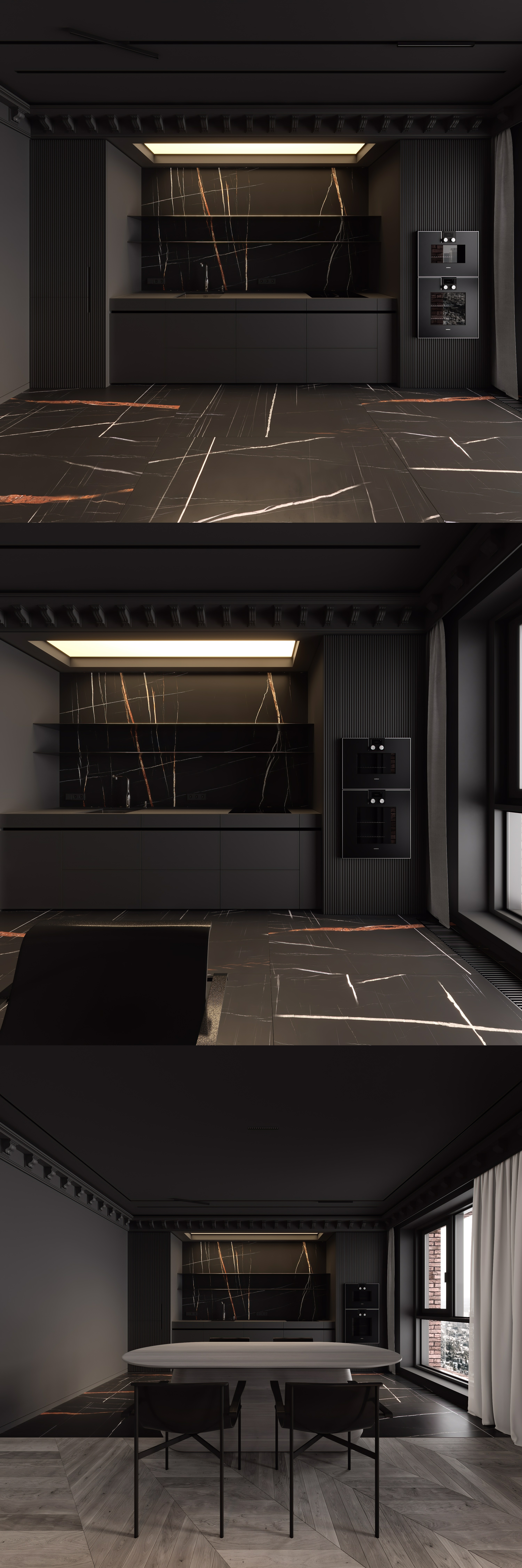 This sophisticated kitchen features matte black cabinetry and a HPL worktop, enhanced by a striking marble backsplash. The minimalist design is complemented by high-end appliances, creating a sleek and modern space perfect for contemporary living.