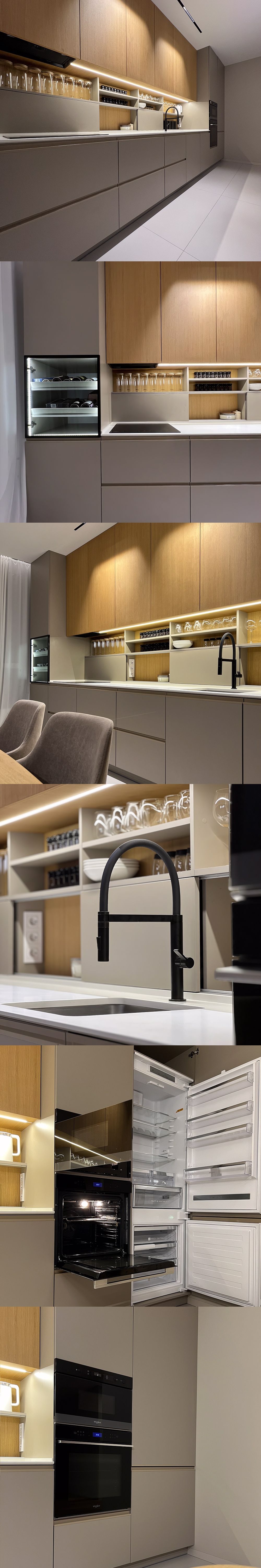 This exquisite kitchen blends modern design with natural wood veneers, creating a warm yet contemporary feel. High-end materials such as real stone, milled painted MDF, and Blum fittings complete the look, making it a perfect balance of elegance and functionality.